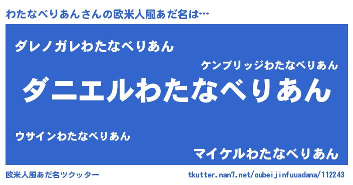 | 男性向けラノベタイトル風あだ名 | 『おまえをオタクにしてやるから、俺をわたなべりあんにしてくれ! 』 |