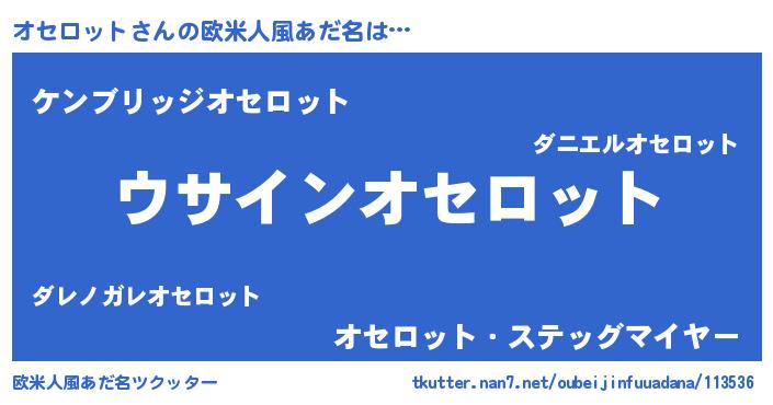 | 女子向けラノベタイトル風あだ名 | 『オセロットの卵を拾いまして』 |