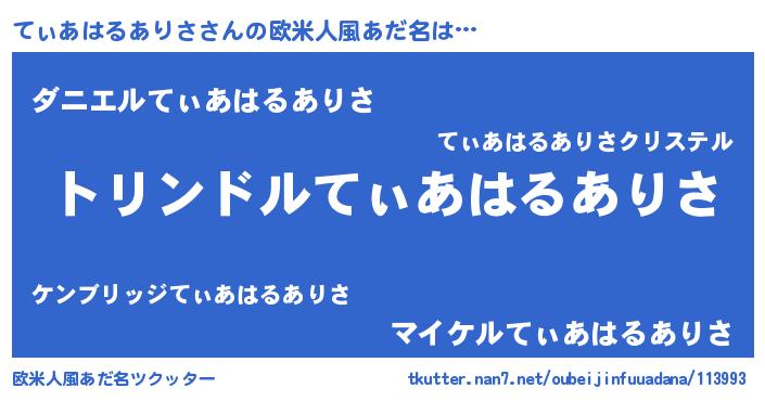 | 男性向けラノベタイトル風あだ名 | 『てぃあはるありさ~年齢イコール彼女いない歴の魔法使い~』 |