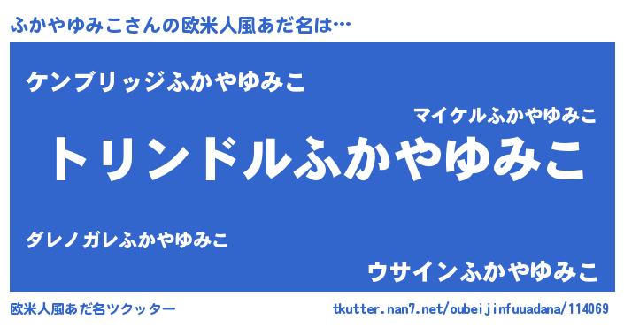 | 男性向けラノベタイトル風あだ名 | 『ふかやゆみこ~年齢イコール彼女いない歴の魔法使い~』 |