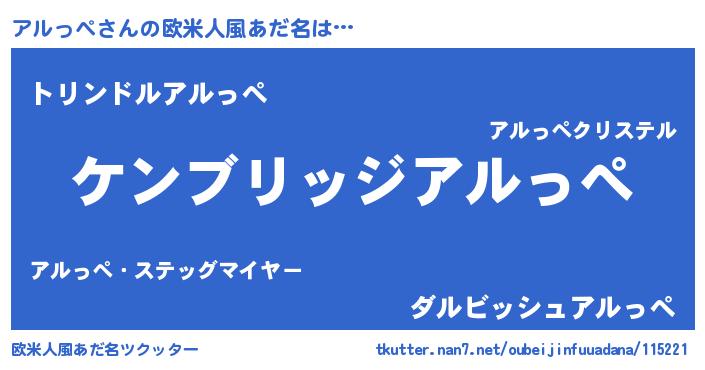 | 男性向けラノベタイトル風あだ名 | 『Re:アルっぺから始める異世界生活』 |