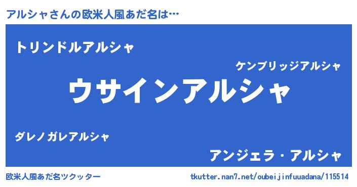 | 男性向けラノベタイトル風あだ名 | 『アルシャの嫁は女の子じゃないと思った?』 |