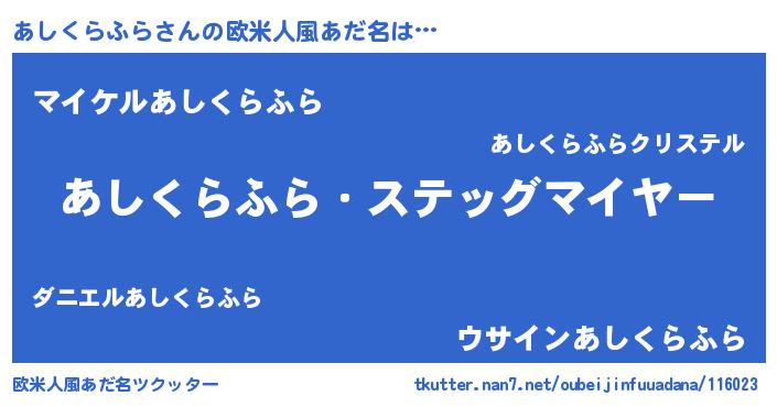 | 男性向けラノベタイトル風あだ名 | 『緋弾のアシクラフラ』 |