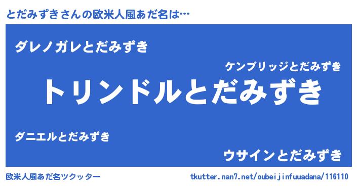 | 男性向けラノベタイトル風あだ名 | 『とだみずき~年齢イコール彼女いない歴の魔法使い~』 |