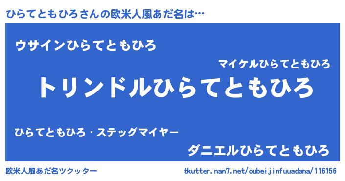 | 男性向けラノベタイトル風あだ名 | 『ひらてともひろ~年齢イコール彼女いない歴の魔法使い~』 |