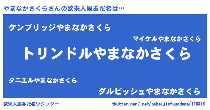 | 男性向けラノベタイトル風あだ名 | 『やまなかさくら~年齢イコール彼女いない歴の魔法使い~』 |