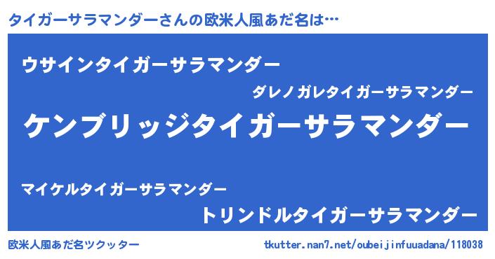 | 男性向けラノベタイトル風あだ名 | 『Re:タイガーサラマンダーから始める異世界生活』 |