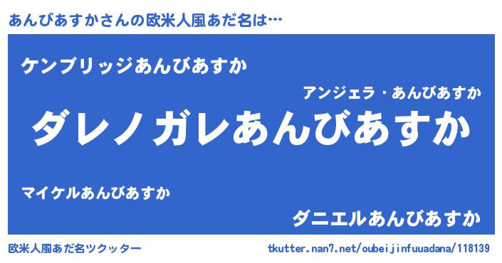 | 男性向けラノベタイトル風あだ名 | 『この素晴らしい世界にあんびあすかを!』 |