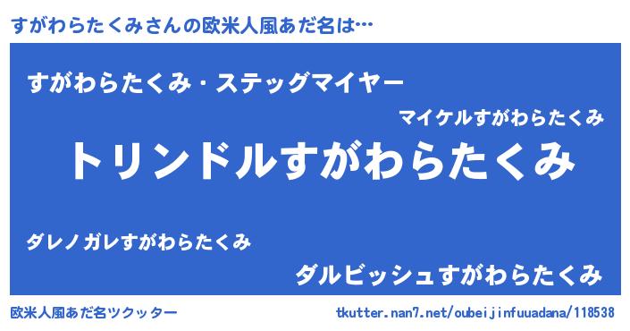 | 男性向けラノベタイトル風あだ名 | 『転生したらすがわらたくみだった件』 |