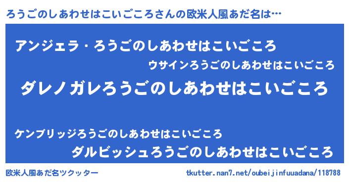| 男性向けラノベタイトル風あだ名 | 『この素晴らしい世界にろうごのしあわせはこいごころを!』 |