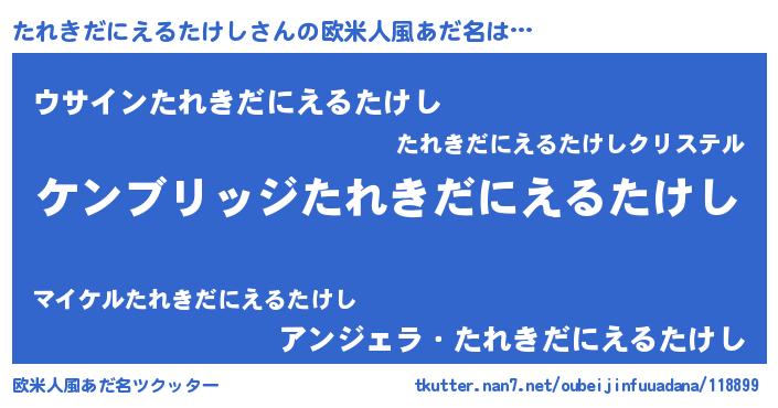 | 男性向けラノベタイトル風あだ名 | 『Re:たれきだにえるたけしから始める異世界生活』 |