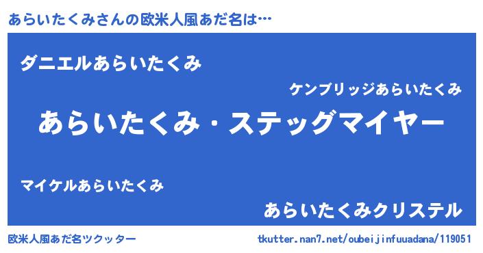 | 男性向けラノベタイトル風あだ名 | 『うちのあらいたくみが世界を掌握している!』 |