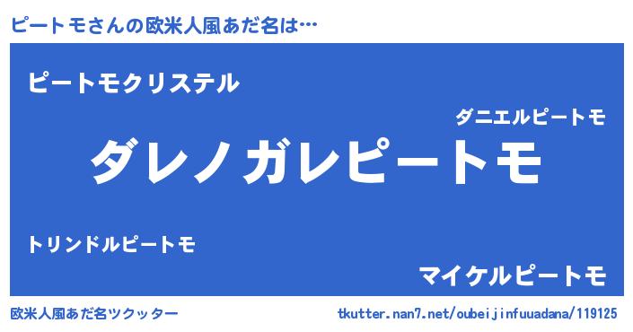 | 男性向けラノベタイトル風あだ名 | 『魔弾の王とピートモ』『ピートモの憂鬱』 |