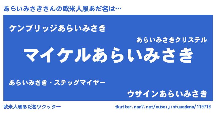 | 男性向けラノベタイトル風あだ名 | 『アライミサキアートオンライン』 |