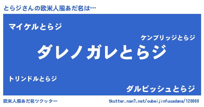 | 男性向けラノベタイトル風あだ名 | 『この素晴らしい世界にとらジを!』 |