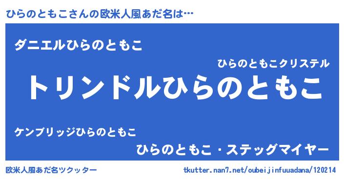 | 女子向けラノベタイトル風あだ名 | 『ひらのともこの玉の輿計画!』 |