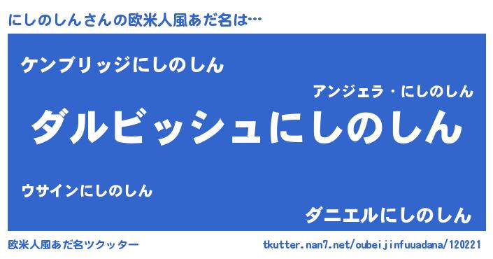 | 男性向けラノベタイトル風あだ名 | 『にしのしんという概念が存在しない退屈な世界 』 |