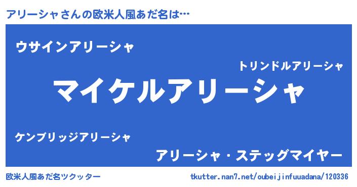| 男性向けラノベタイトル風あだ名 | 『アリーシャアートオンライン』 |