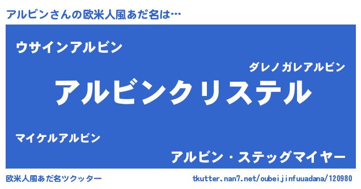 | ポケモン風あだ名 | 『アルビダネ』『ヒアルビン』 |