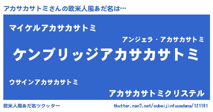 | 男性向けラノベタイトル風あだ名 | 『Re:アカサカサトミから始める異世界生活』 |