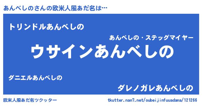 | 男性向けラノベタイトル風あだ名 | 『あんべしのの嫁は女の子じゃないと思った?』 |