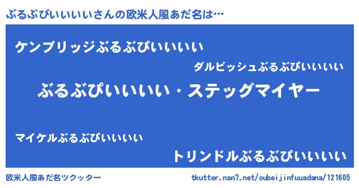 | 男性向けラノベタイトル風あだ名 | 『うちのぶるぶぴいいいいが世界を掌握している!』 |