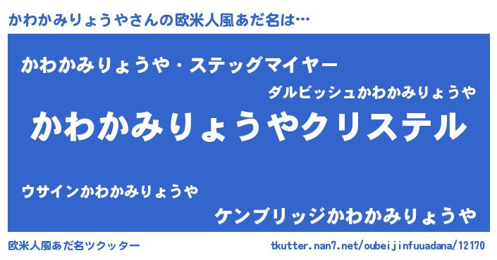 | 男性向けラノベタイトル風あだ名 | 『やはりかわかみりょうやの青春ラブコメはまちがっている 』 |