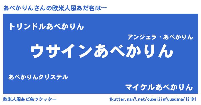 | 男性向けラノベタイトル風あだ名 | 『あべかりんの嫁は女の子じゃないと思った?』 |