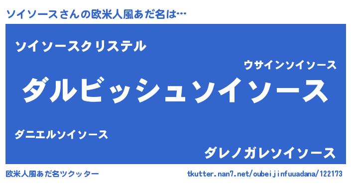 | 男性向けラノベタイトル風あだ名 | 『ソイソースという概念が存在しない退屈な世界 』 |