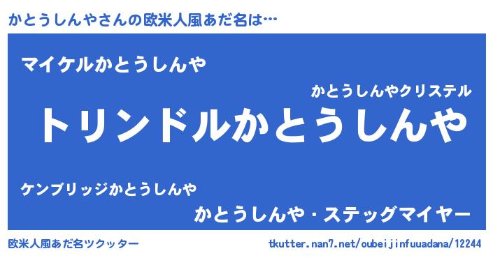 | 男性向けラノベタイトル風あだ名 | 『かとうしんや~年齢イコール彼女いない歴の魔法使い~』 |