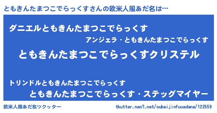 | 男性向けラノベタイトル風あだ名 | 『やはりともきんたまつこでらっくすの青春ラブコメはまちがっている 』 |