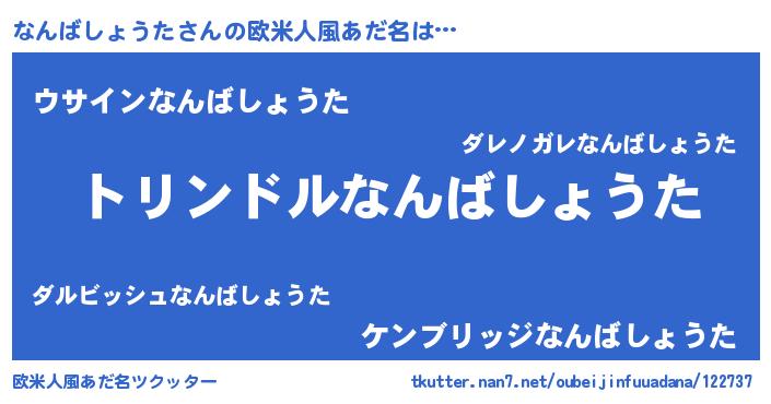 | 男性向けラノベタイトル風あだ名 | 『なんばしょうた~年齢イコール彼女いない歴の魔法使い~』 |
