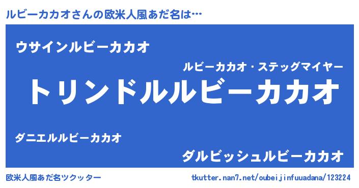 | 男性向けラノベタイトル風あだ名 | 『ルビーカカオ~年齢イコール彼女いない歴の魔法使い~』 |