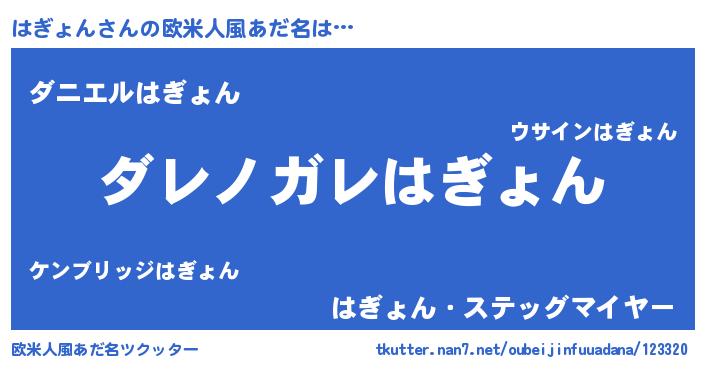 | 意味不明あだ名 | 『住所不定無職はぎょん(95歳)』 |