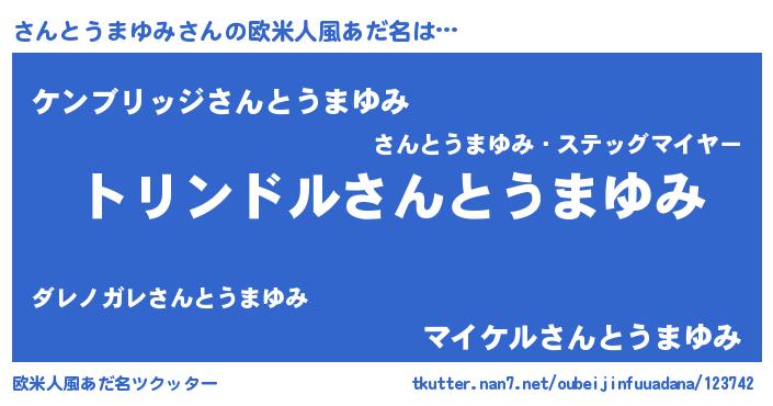 | 男性向けラノベタイトル風あだ名 | 『転生したらさんとうまゆみだった件』 |