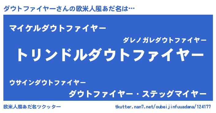 | 男性向けラノベタイトル風あだ名 | 『ダウトファイヤー~年齢イコール彼女いない歴の魔法使い~』 |