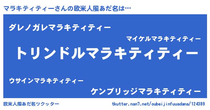| 男性向けラノベタイトル風あだ名 | 『マラキティティー~年齢イコール彼女いない歴の魔法使い~』 |