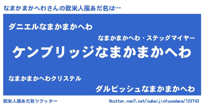 | 女子向けラノベタイトル風あだ名 | 『なまかまかへわなんてお断りですっ。』 |
