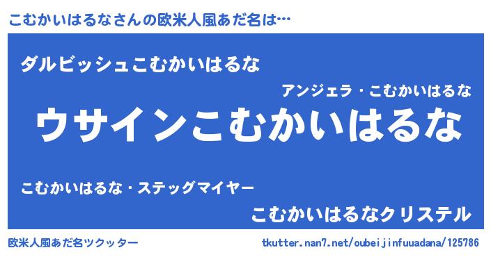 | 男性向けラノベタイトル風あだ名 | 『こむかいはるなの嫁は女の子じゃないと思った?』 |