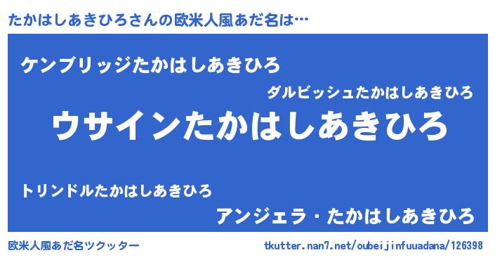 | 女子向けラノベタイトル風あだ名 | 『たかはしあきひろの卵を拾いまして』 |