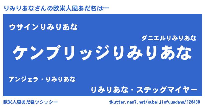 | 男性向けラノベタイトル風あだ名 | 『Re:りみりあなから始める異世界生活』 |