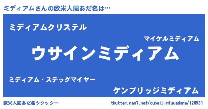 | 男性向けラノベタイトル風あだ名 | 『ミディアムの嫁は女の子じゃないと思った?』 |
