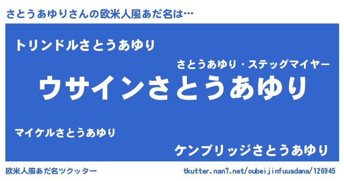 | 男性向けラノベタイトル風あだ名 | 『さとうあゆりの嫁は女の子じゃないと思った?』 |