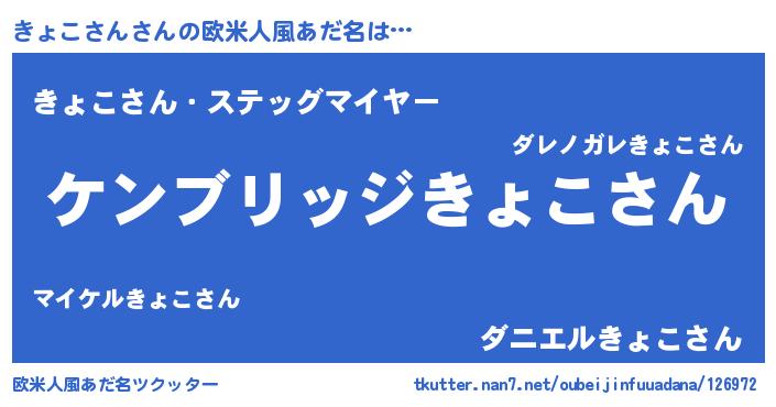 | 男性向けラノベタイトル風あだ名 | 『Re:きょこさんから始める異世界生活』 |