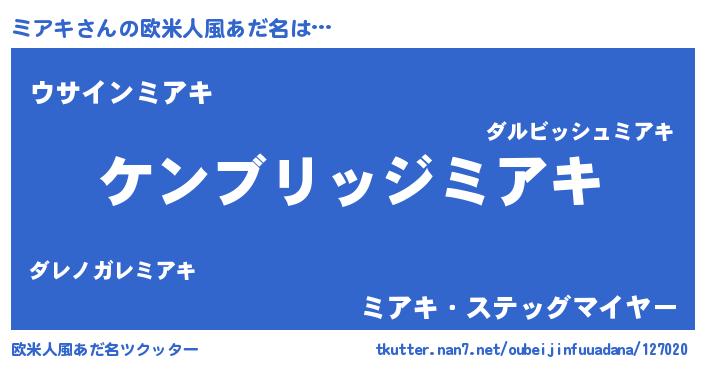 | 男性向けラノベタイトル風あだ名 | 『Re:ミアキから始める異世界生活』 |