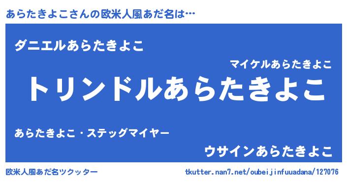 | 男性向けラノベタイトル風あだ名 | 『あらたきよこ~年齢イコール彼女いない歴の魔法使い~』 |