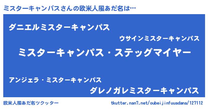 | 男性向けラノベタイトル風あだ名 | 『うちのミスターキャンパスが世界を掌握している!』 |
