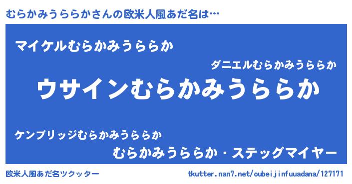 | 男性向けラノベタイトル風あだ名 | 『むらかみうららかの嫁は女の子じゃないと思った?』 |