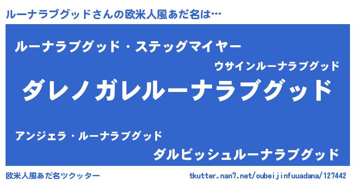 | 男性向けラノベタイトル風あだ名 | 『魔弾の王とルーナラブグッド』 |