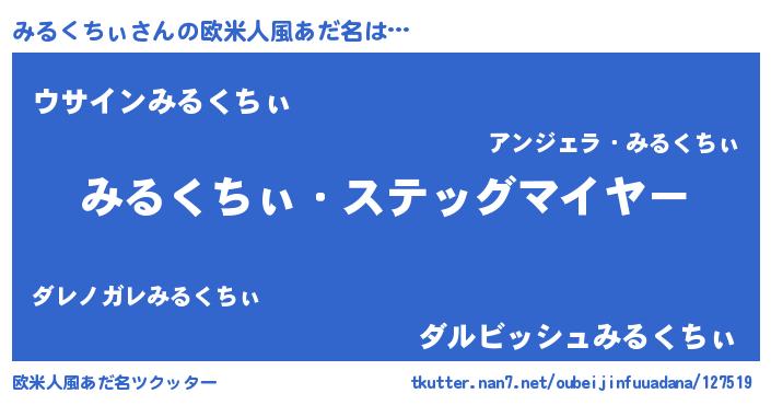 | 男性向けラノベタイトル風あだ名 | 『うちのみるくちぃが世界を掌握している!』 |